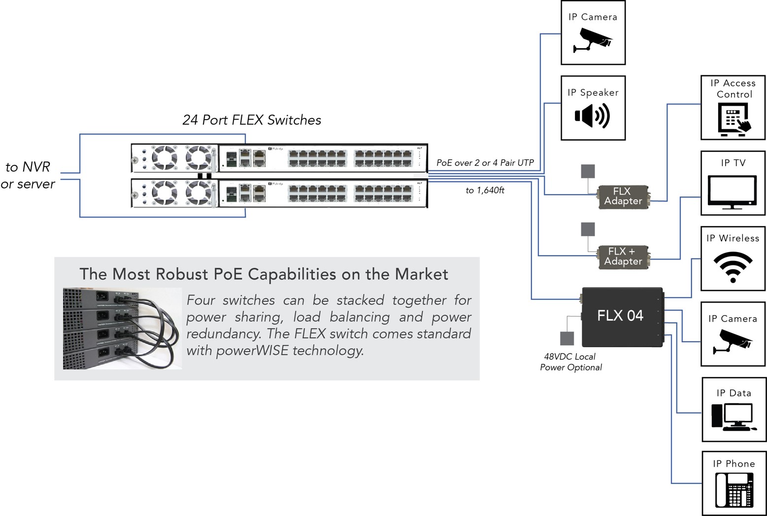 FLEX switch delivers fast Ethernet and PoE++ (50W per port) over multiple pairs of UTP cable with five times the reach of traditional switches, up to 1,640 ft (500m).