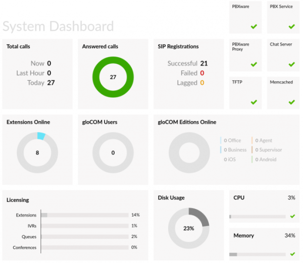 This edition has all the features any user would require from an IP PBX, but let’s name a few: VoIP soft phone, Instant Messaging client, Operator panel, Conference administration, Call center communicator, Fax send/receive, MS Windows desktop application, gloCOM.
